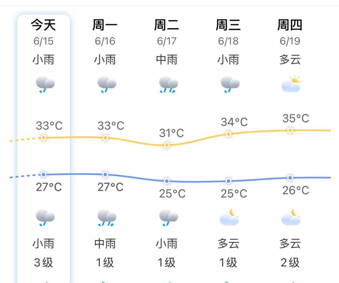 16日8时—17日8时:日白天到夜里,小雨,西南风2级,气温34~26℃。