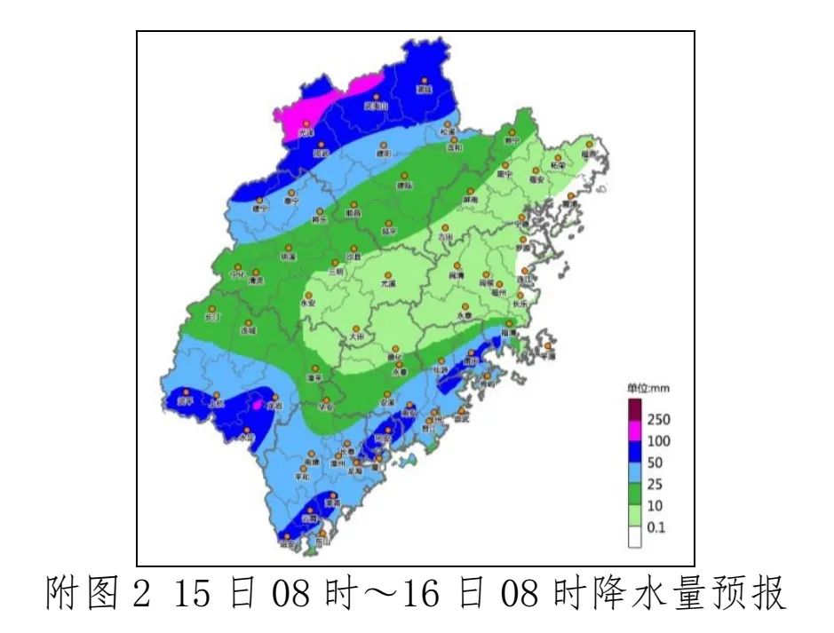 15日夜间到16日白天,南平西北部、三明西北部、龙岩南部、漳州东部和南部、厦门南部的部分有暴雨,局部大暴雨,其余地区局部暴雨。24小时累计雨量50~80毫米,局部150毫米。雷雨时局地伴有短时强降水、7~10级大风等强对流天气。