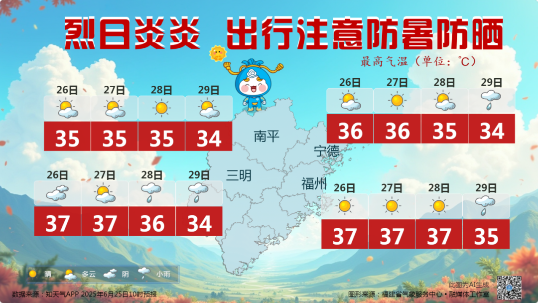 气温方面,未来35℃将频频出现,尤其是福州、宁德、南平、三明等地,午后最高气温可达36~37℃。暑气逼人,中午前后的高温时段,要尽量避免户外活动,谨防中暑。