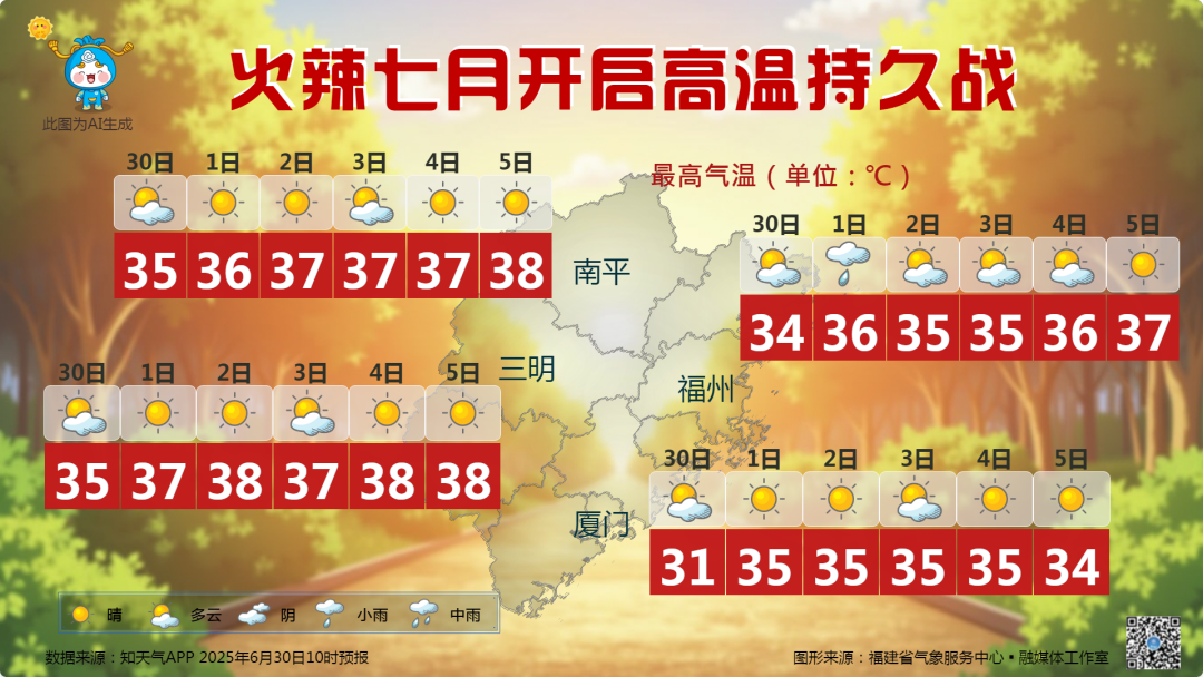 “炎值”高,福建开启高温持久战!据福建气象消息,7月仍然火辣开场,副热带高压加强西伸牢牢控制福建,午后多阵雨或雷雨,7月1日,全省多云为主,部分有阵雨或雷阵雨,局部大雨,7月2日~6日,全省晴到多云,局部有阵雨或雷阵雨。