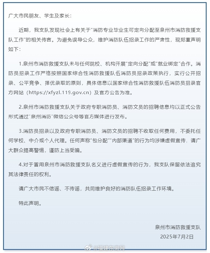 7月2日,泉州消防发布声明。声明中表示:社会上关于“消防专业毕业生可定向分配至泉州市消防救援支队工作”的传言不实。请广大市民不信谣、不传谣!