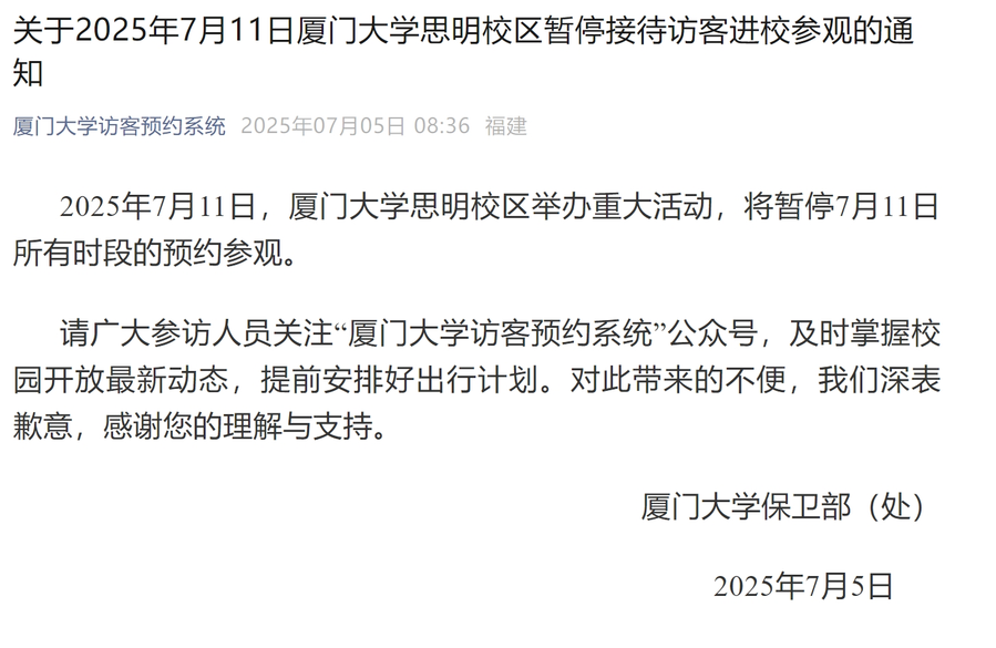 2025年7月11日,厦门大学思明校区举办重大活动,将暂停7月11日所有时段的预约参观。