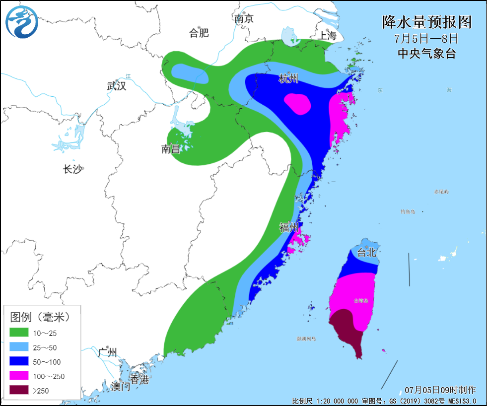 降雨预报:5~8日,台湾岛、福建沿海、浙江、安徽南部等地有大到暴雨,台湾中南部、福建中北部沿海、浙江东部沿海和中部等局地有大暴雨,台湾岛南部局地特大暴雨(累计降雨量可达400毫米)。