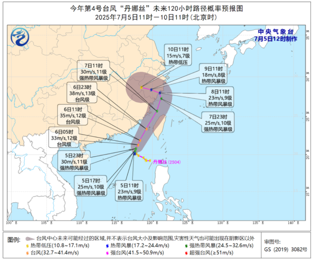 中央气象台消息,7月5日13时台风“丹娜丝”中心位于台湾鹅銮鼻西偏南约400公里海面上(北纬20.3度、东经117.4度),中心附近最大风力9级(热带风暴级)。