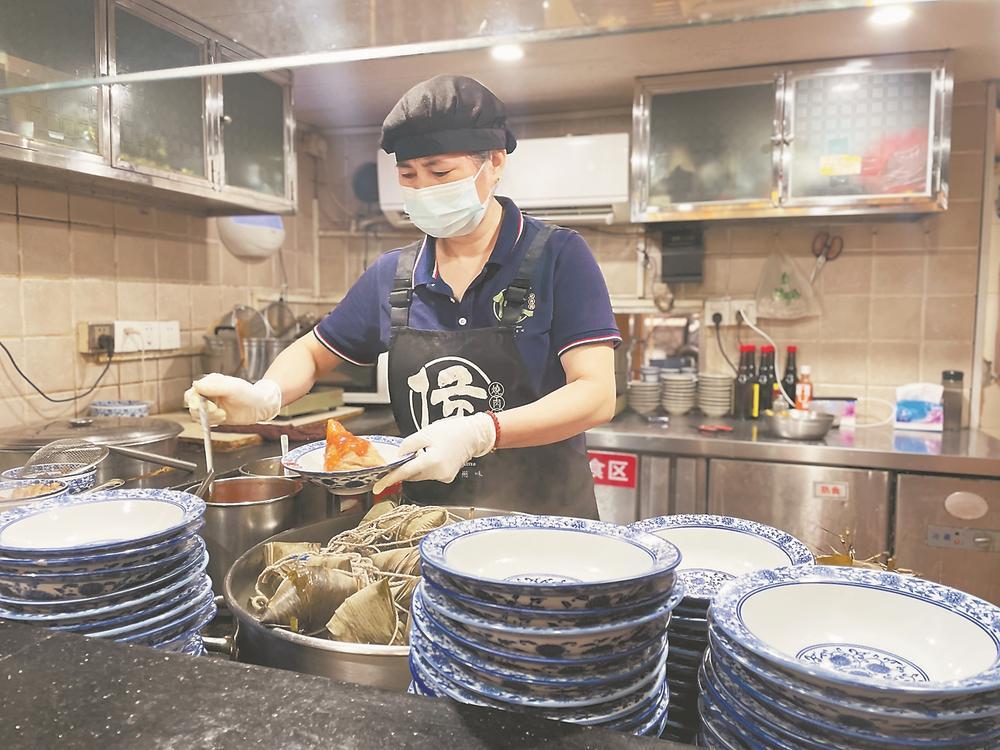 灶台边,员工林碧霞娴熟地剥开粽叶,倒上酱汁,再盛一碗牛肉羹,端到顾客的桌上。这家小店的员工多为10~20年工龄的“老街坊”,熟悉老客口味与节奏。“40多年间,我们从未离开‘东街-西街’半径800米,见证着老城修缮、路面翻新,也实打实成为文旅发展的受益者。”王雪霞说。