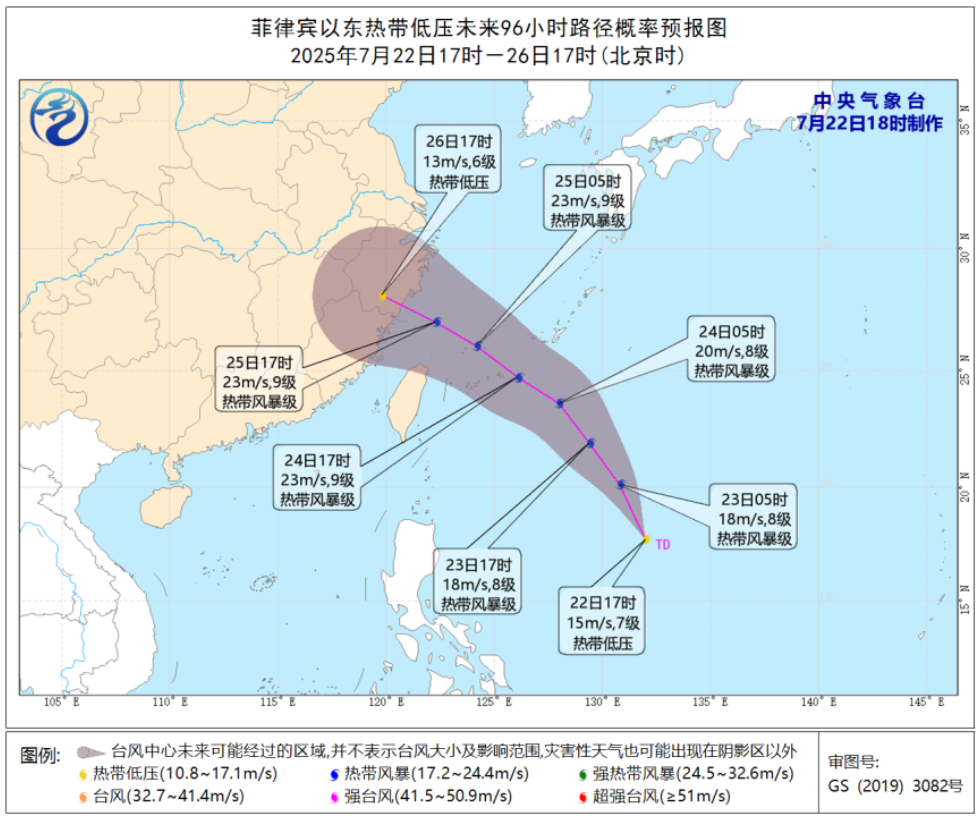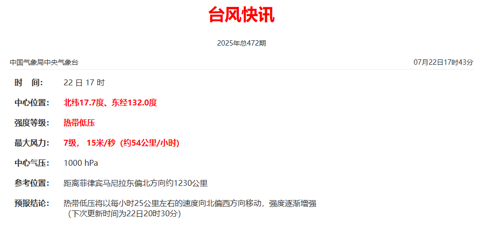 据中央气象台最新消息,位于菲律宾以东洋面的热带扰动已于今天(22日)下午5时发展为热带低压。