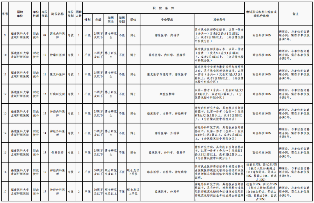 福建医科大学孟超肝胆医院公开招聘工作人员43名
