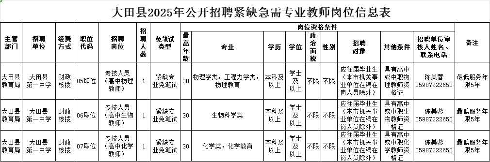 大田县补充招聘紧缺急需专业教师3名