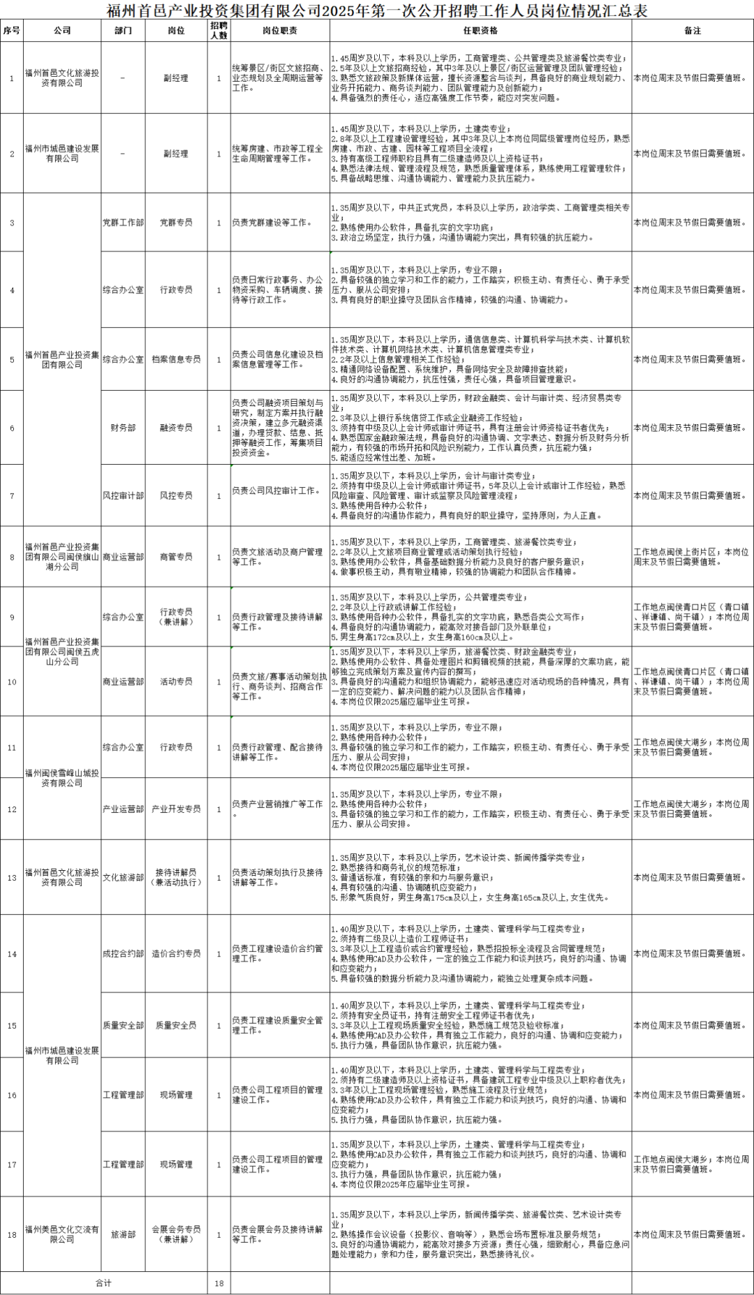 福州首邑产业投资集团有限公司公开招聘工作人员18名