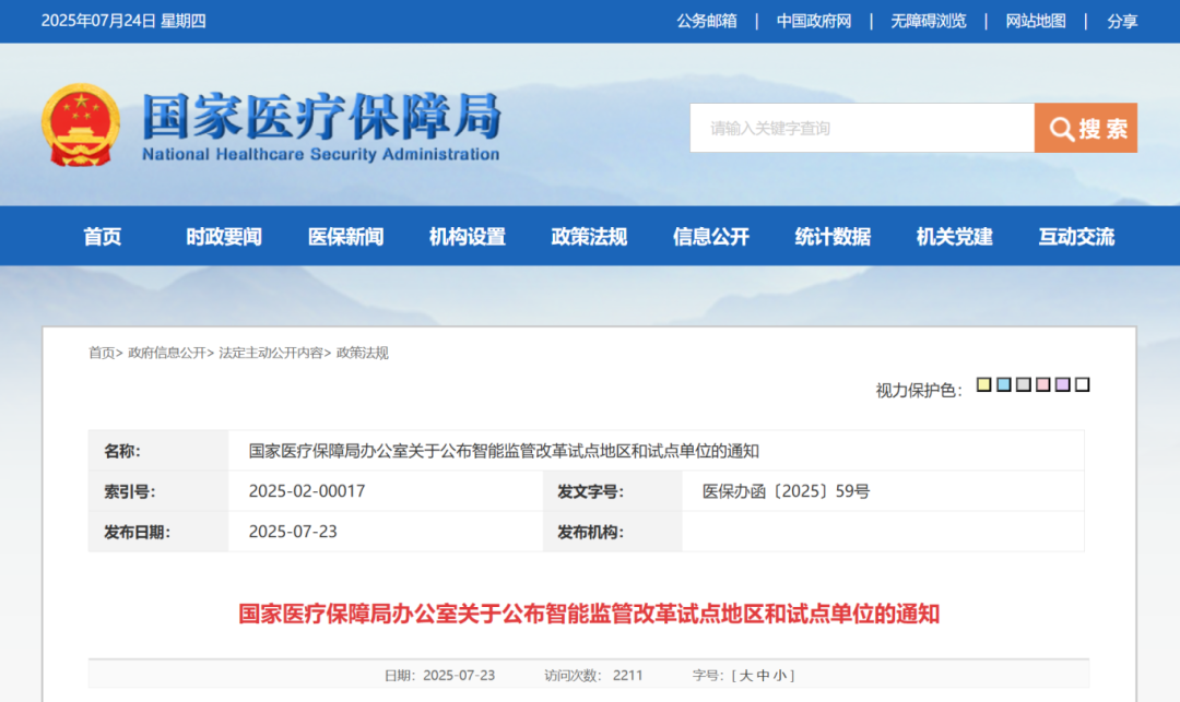 按照《国家医疗保障局办公室关于开展智能监管改革试点的通知》(医保办函〔2025〕40号)工作安排,经定点医药机构自愿报名、各省级医保局推选、国家医保局筛选,确定试点地区92个(其中天津、河北、山东、海南、贵州、青海、宁夏为全省域范围内试点)、试点定点医药机构359家(名单附后)。