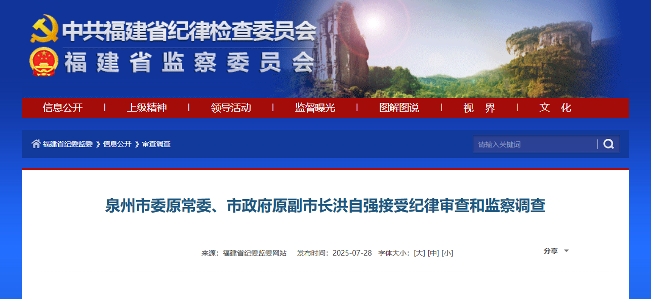 泉州市委原常委、市政府原副市长洪自强涉嫌严重违纪违法,目前正接受福建省纪委监委纪律审查和监察调查。