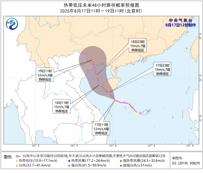 据中国天气预报,预计南海热带低压成长为台风的概率不大,但仍将于17日夜间至18日凌晨登陆或擦过海南岛南部沿海,然后进入北部湾。在其影响下,今起三天广东中南部、海南岛、广西中南部将有大到暴雨,沿海局地大暴雨。