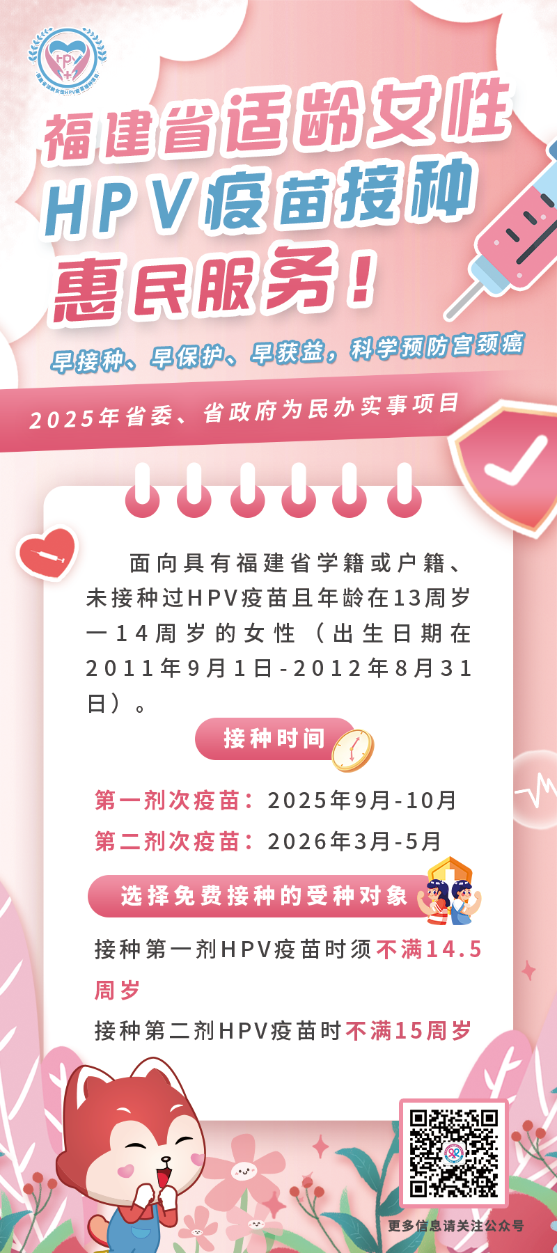 为积极响应国家加速消除宫颈癌行动计划,根据福建省委、省政府的部署,省卫健委联合省教育厅、省财政厅、省妇联,持续完善适龄女性人乳头瘤病毒(HPV)疫苗接种项目,为具有福建省学籍或户籍、未接种过HPV疫苗且年龄在13周岁至14周岁的女性,提供HPV疫苗接种服务。2025年福建省适龄女性HPV疫苗接种项目即将如期开展。