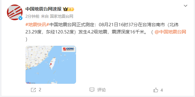 中国地震台网正式测定:08月21日16时37分在台湾台南市(北纬23.29度,东经120.52度)发生4.2级地震,震源深度16千米。
