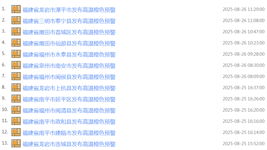 福建多地也发布高温橙色预警。
