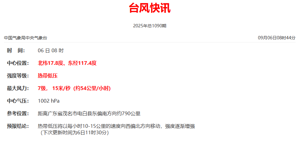 据中央气象台消息,南海热带低压已于5日晚在南海中东部海面生成,今天(6日)早晨5点钟其中心位于广东省茂名市电白县东偏南约800公里的海面上,中心附近最大风力有7级(15米/秒),中心最低气压为1002百帕。