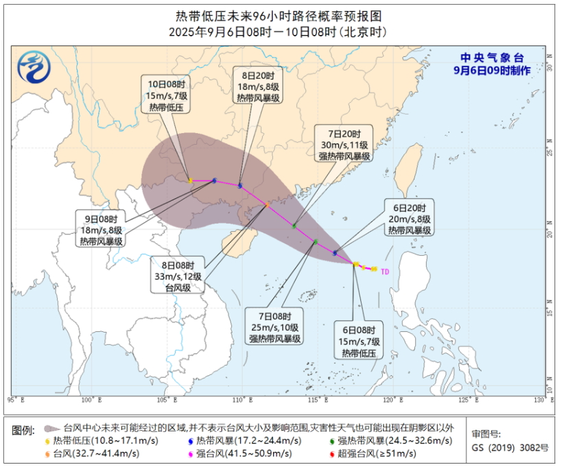 9月6日8时至7日8时,南海大部、巴士海峡、台湾海峡南部、珠江口区、广东中东部沿海将有6~8级大风,其中南海东部部分海域风力可达9~10级,阵风11~12级。