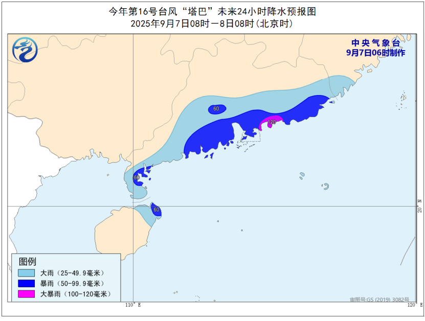 降水预报:9月7日08时至8日08时,福建东南部、广东中南部、海南岛东部等地部分地区有大到暴雨,其中,广东东南部沿海等地部分地区有大暴雨(100-120毫米)。