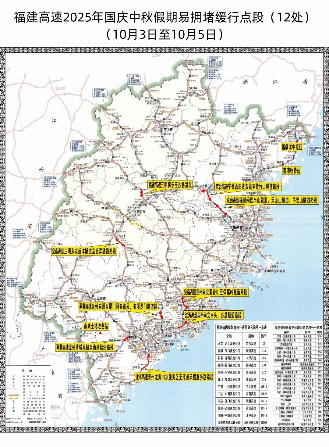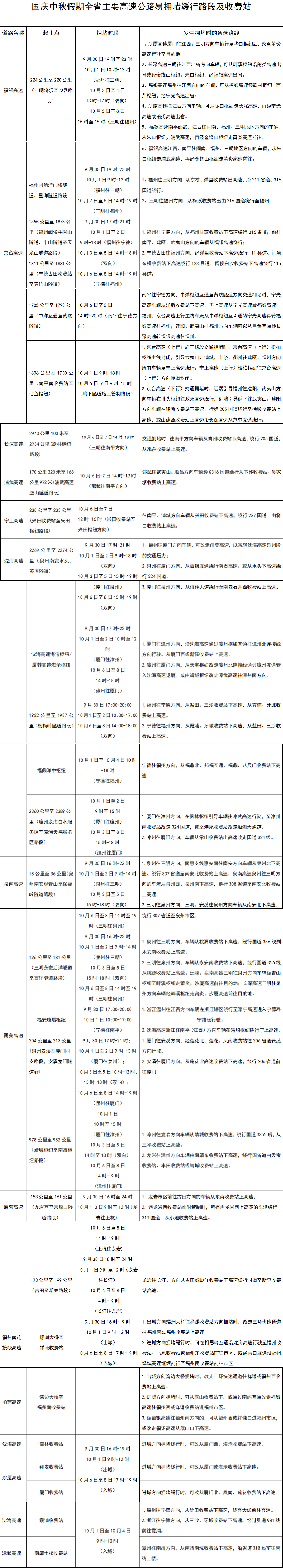 涉及7条高速、8个设区市共计17处路段,分别为沈海高速泉州南安(泉州往厦门)、厦门海沧枢纽(漳州往厦门)、漳州漳浦(漳州往厦门)、霞浦(宁德往浙江)段,泉南高速泉州南安(三明往泉州)、三明永安(泉州往三明)段,沙厦高速泉州德化(三明往泉州)段,福银高速福州闽清、三明将乐(三明往福州)段,京台高速福州闽侯、宁德古田(宁德往福州)、南平建阳(南平往福州)段,甬莞高速福州永泰至闽侯(莆田往福州)、泉州安溪至厦门同安(泉州往厦门)、漳州南靖(漳州往厦门),厦蓉高速龙岩上杭、新罗(入省方向)段。