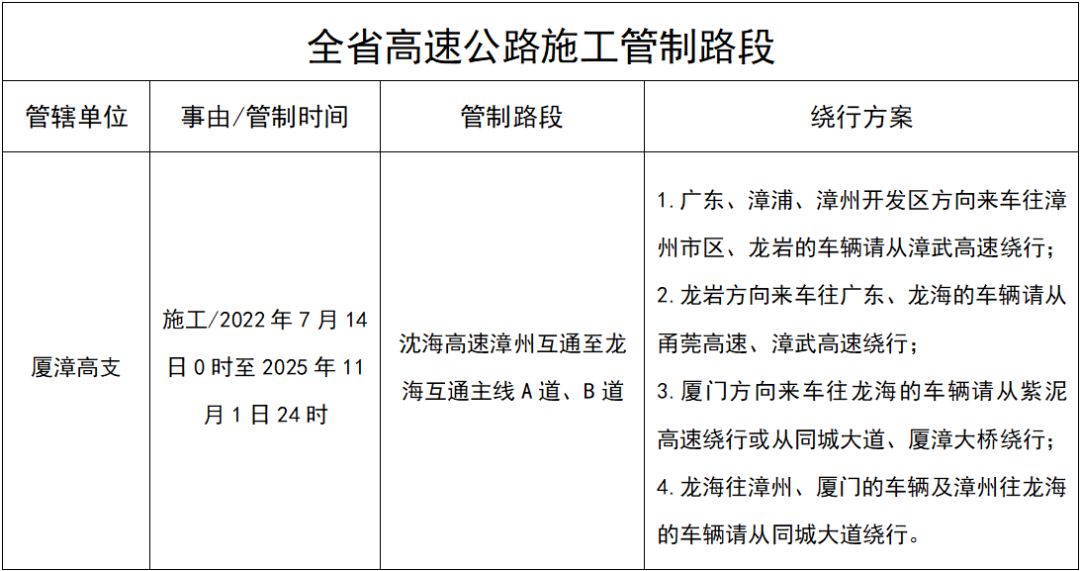 全省高速公路因施工采取交通管制路段1处,为沈海高速漳州互通至龙海互通路段。