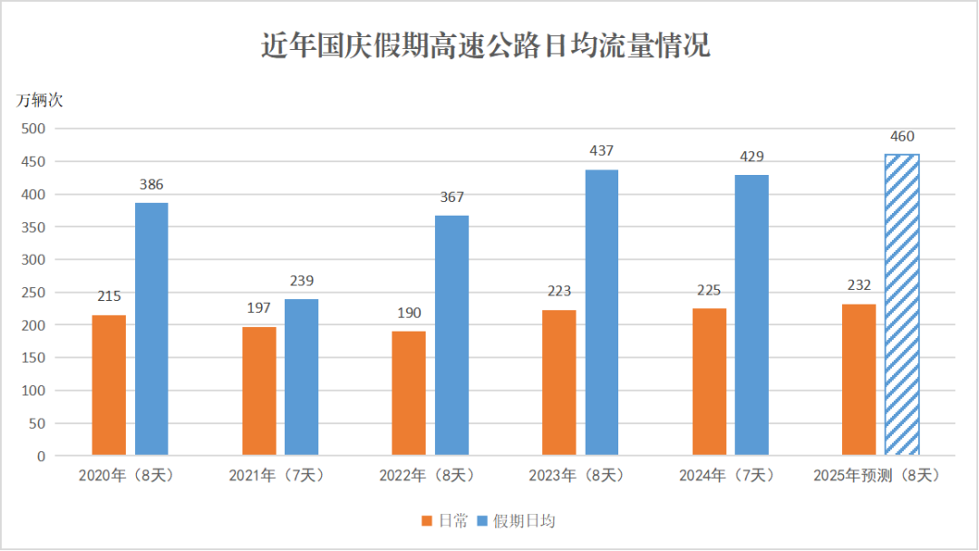 全省高速公路出入口(含省际)日均流量预计将达460万辆次,较日常上升100%以上。基于历史数据和当前趋势分析,10月1日、7日将分别迎来出行、返程车流高峰。