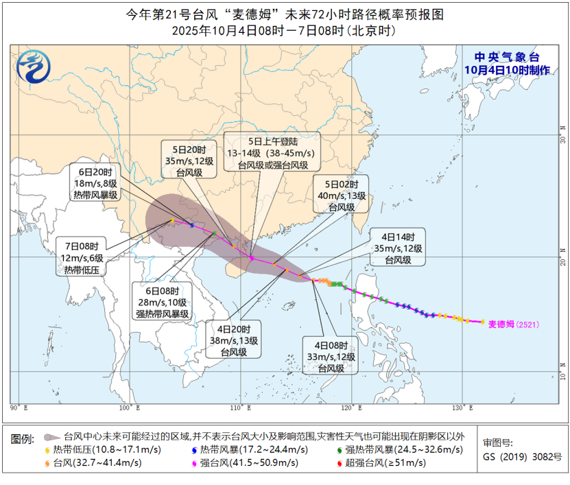 4日11时,台风“麦德姆”距离广东省湛江市徐闻县东偏南方向约650公里,预计将以每小时25公里左右的速度向西偏北方向移动,并向广东西部到海南岛东部一带沿海靠近,将于5日上午在广东电白至海南万宁一带沿海登陆(台风级或强台风级,13-14级,38-45米/秒),登陆后强度逐渐减弱。
