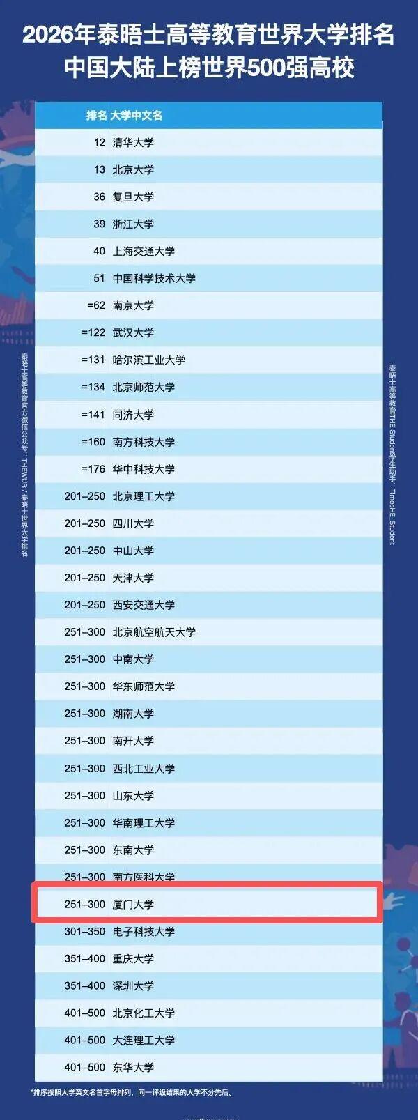 中国内地上榜高校数量连续三年增加,从2024年86所到2025年94所,再到2026年97所,今年,厦门大学再次上榜。