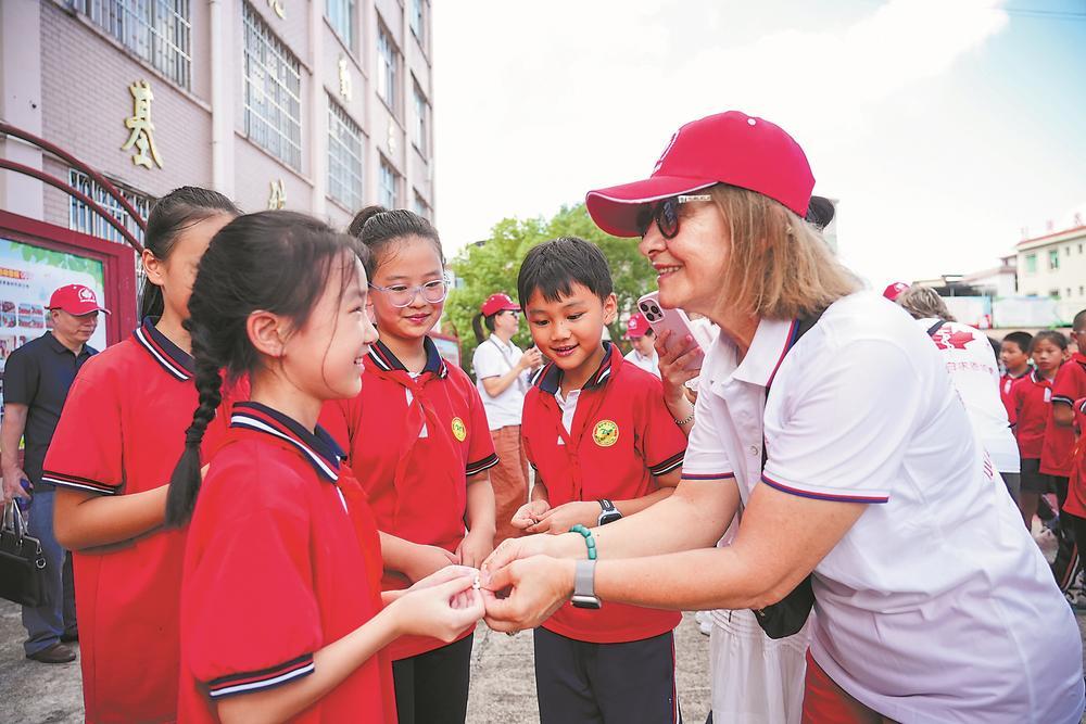 在长汀县濯田中心小学,代表团成员将加拿大白求恩协会徽章赠送给当地学生。章宸睿 摄