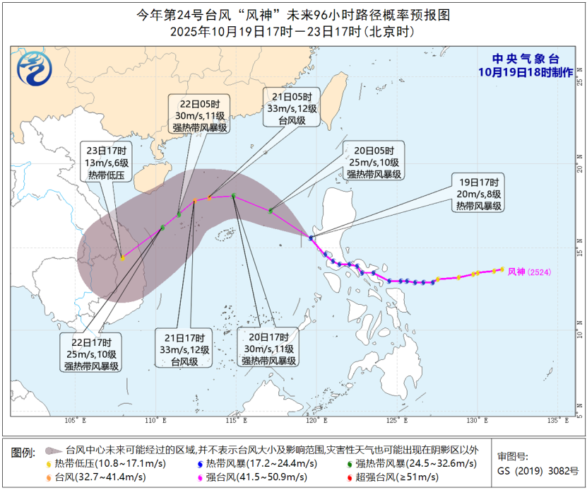 今年第24号台风“风神”今天14时中心位于菲律宾吕宋岛上(北纬14.6度、东经120.5度),中心附近最大风力8级(20米/秒,热带风暴级),预计将以每小时35公里左右的速度向西北方向移动,强度逐渐增强,最强可达强热带风暴级或台风级。