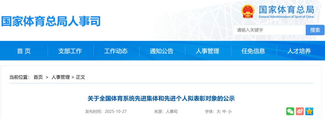 根据全国体育系统先进集体和先进个人评选表彰工作安排,经逐级推荐和评选,全国体育系统先进集体和先进个人评选表彰工作领导小组审核,拟表彰全国体育系统先进集体67个、先进个人162名。为充分发扬民主,广泛听取意见,接受社会监督,现将拟表彰对象予以公示。公示期为2025年10月28日至2025年11月3日。