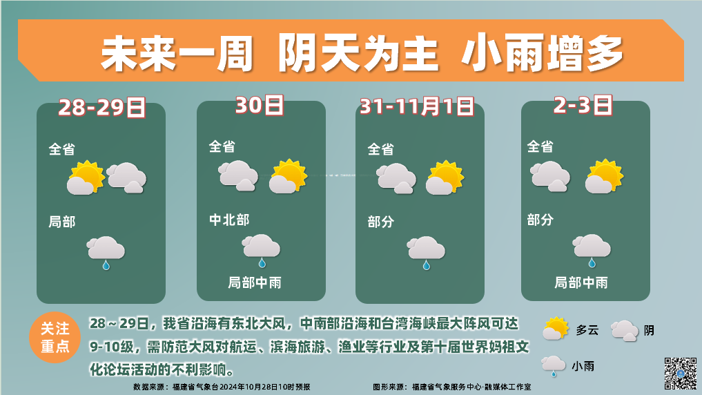 降水方面,我省大部以阴天到多云为主,小雨有所增多,海上仍有大风天气,具体天气如下。