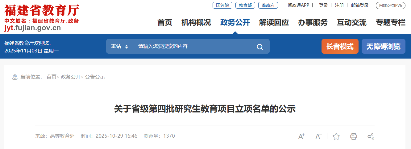 最新!福建省教育厅发布关于省级第四批研究生教育项目立项名单的公示,公示时间为:2025年10月29日至11月4日,一起来看——
