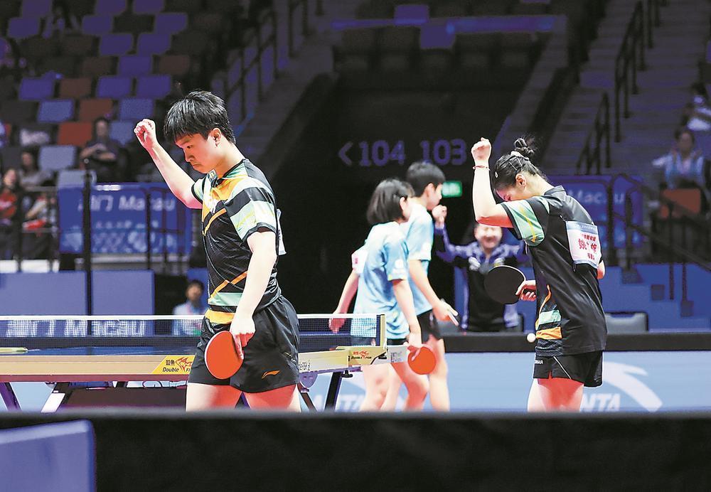 在乒乓球18岁以下混合双打半决赛中获胜后,福建队组合罗杰乘(左一)/姚梓旋(右一)庆祝胜利。新华社