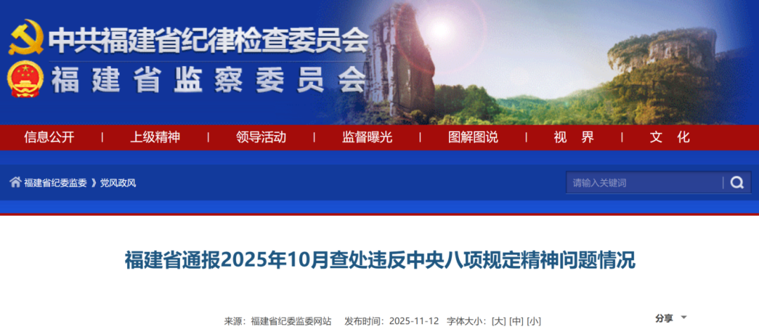 2025年10月,福建省查处违反中央八项规定精神问题849件,批评教育和处理1050人,给予党纪政务处分725人。福建省2025年以来查处违反中央八项规定精神情况如下: