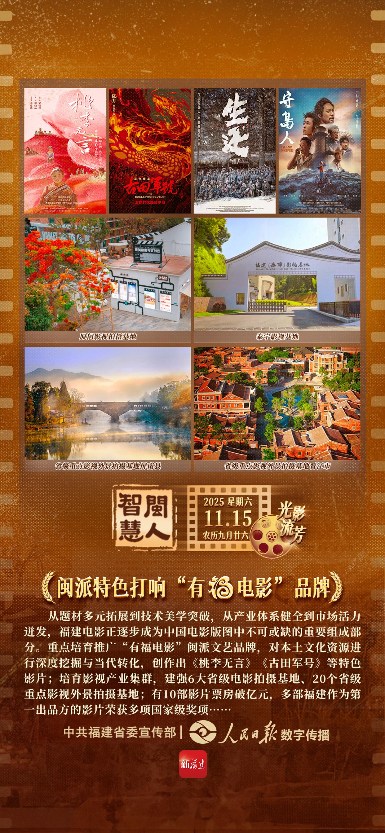 从题材多元拓展到技术美学突破,从产业体系健全到市场活力迸发,福建电影正逐步成为中国电影版图中不可或缺的重要组成部分。重点培育推广“有福电影”闽派文艺品牌,对本土文化资源进行深度挖掘与当代转化,创作出《桃李无言》《古田军号》等特色影片;培育影视产业集群,建强6大省级电影拍摄基地、20个省级重点影视外景拍摄基地;有10部影片票房破亿元,多部福建作为第一出品方的影片荣获多项国家级奖项……