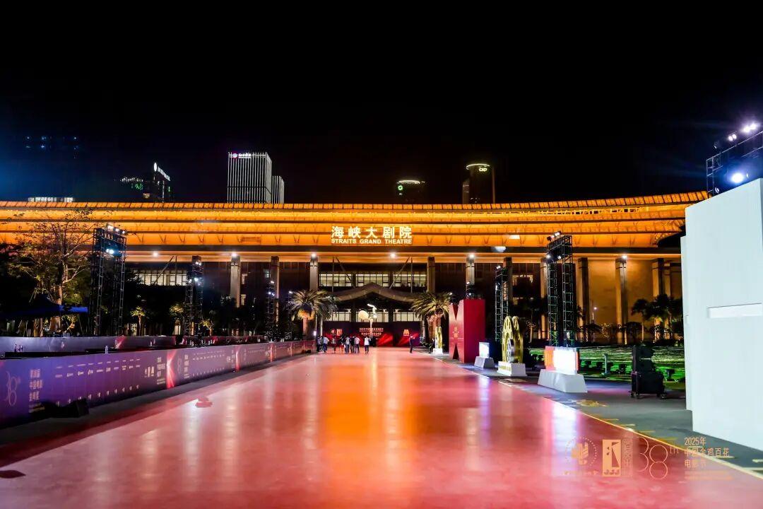 “金鸡百花梦想大道”坐落于海峡大剧院会展中心东广场,总占地面积达27993平方米。其中,作为核心打卡区域的常态化红毯区长约137米、宽约20米,完整复刻了电影节闭幕式现场的华丽氛围。项目整体以“梦想”为主题,由梦想之门、主题落地字、固定座椅区及常态化红毯等部分组成,寓意电影艺术工作者对艺术理想的不懈追求。设计上,梦想之门与远处的金鸡奖杯造型形成视觉呼应,强化了场所的电影文化象征意义。