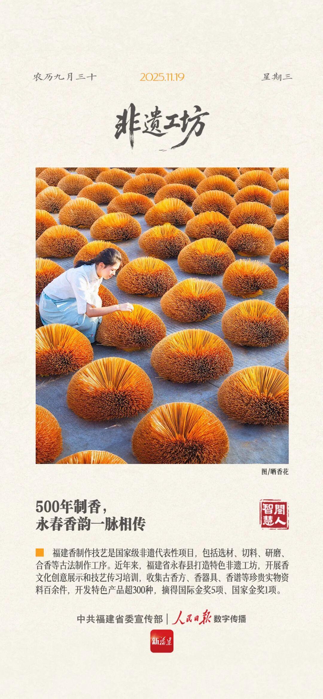 福建香制作技艺是国家级非遗代表性项目,包括选材、切料、研磨、合香等古法制作工序。近年来,福建省永春县打造特色非遗工坊,开展香文化创意展示和技艺传习培训,收集古香方、香器具、香谱等珍贵实物资料百余件,开发特色产品超300种,摘得国际金奖5项、国家金奖1项。