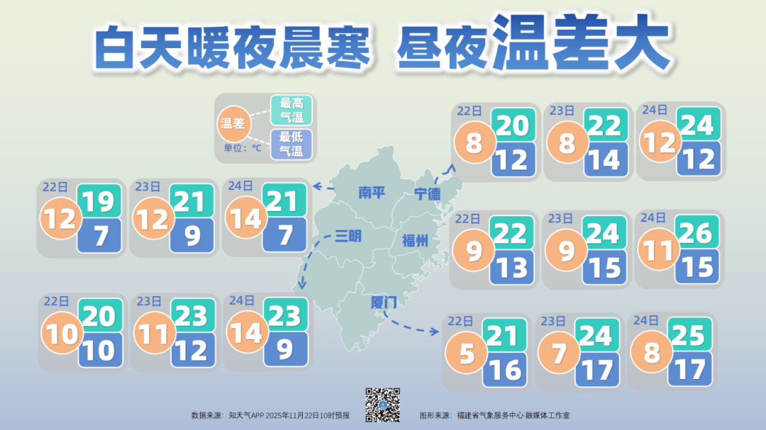 温度方面,23日起福建大部最高气温将逐日上升,白天温暖舒适,但是夜晨最低温度依旧较低,昼夜温差逐渐拉大,24日普遍全省温差都大于10℃,尤其是内陆地区,如三明市温差接近15℃。请适时增减衣物,早晚添衣,谨防感冒。24日冷空气进一步南下,25日—28日夜晨西部、北部地区部分县市有低温霜冻天气,请关注低温对能源保供和农业生产的不利影响。