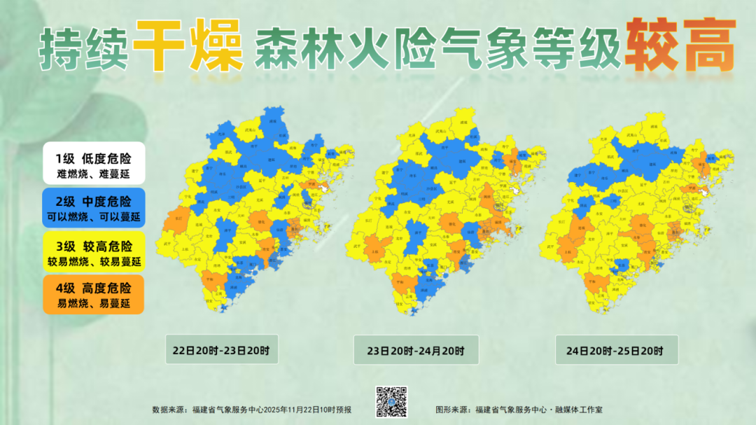 今明两天福建全省维持多云到晴的天气格局,暖阳相伴,正值周末,适宜安排一场说走就走的户外出游。24日,冷空气进一步南下,全省多云,局部有阵雨。近期持续几日都难觅降雨踪迹,降雨量总体偏少,天气持续干燥,湿度小,加上风力较大,福建森林火险气象等级较高。未来三天火险风险的范围和强度逐日扩大,要注意野外用火安全,以及关注持续干旱的发展情况对农业等行业的不利影响。