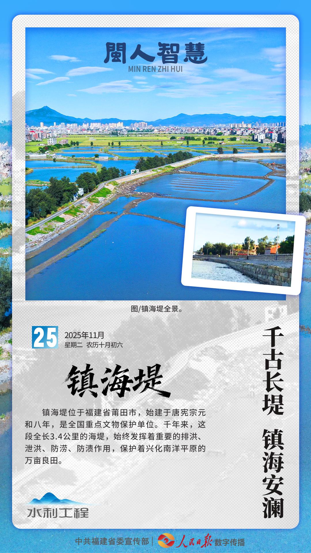 镇海堤位于福建省莆田市,始建于唐宪宗元和八年,是全国重点文物保护单位。千年来,这段全长3.4公里的海堤,始终发挥着重要的排洪、泄洪、防涝、防溃作用,保护着兴化南洋平原的万亩良田。