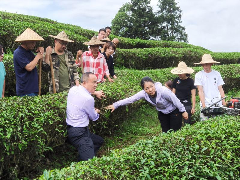廖红教授(前排左二)在一处武夷山生态茶园指导茶农种植。(资料图)