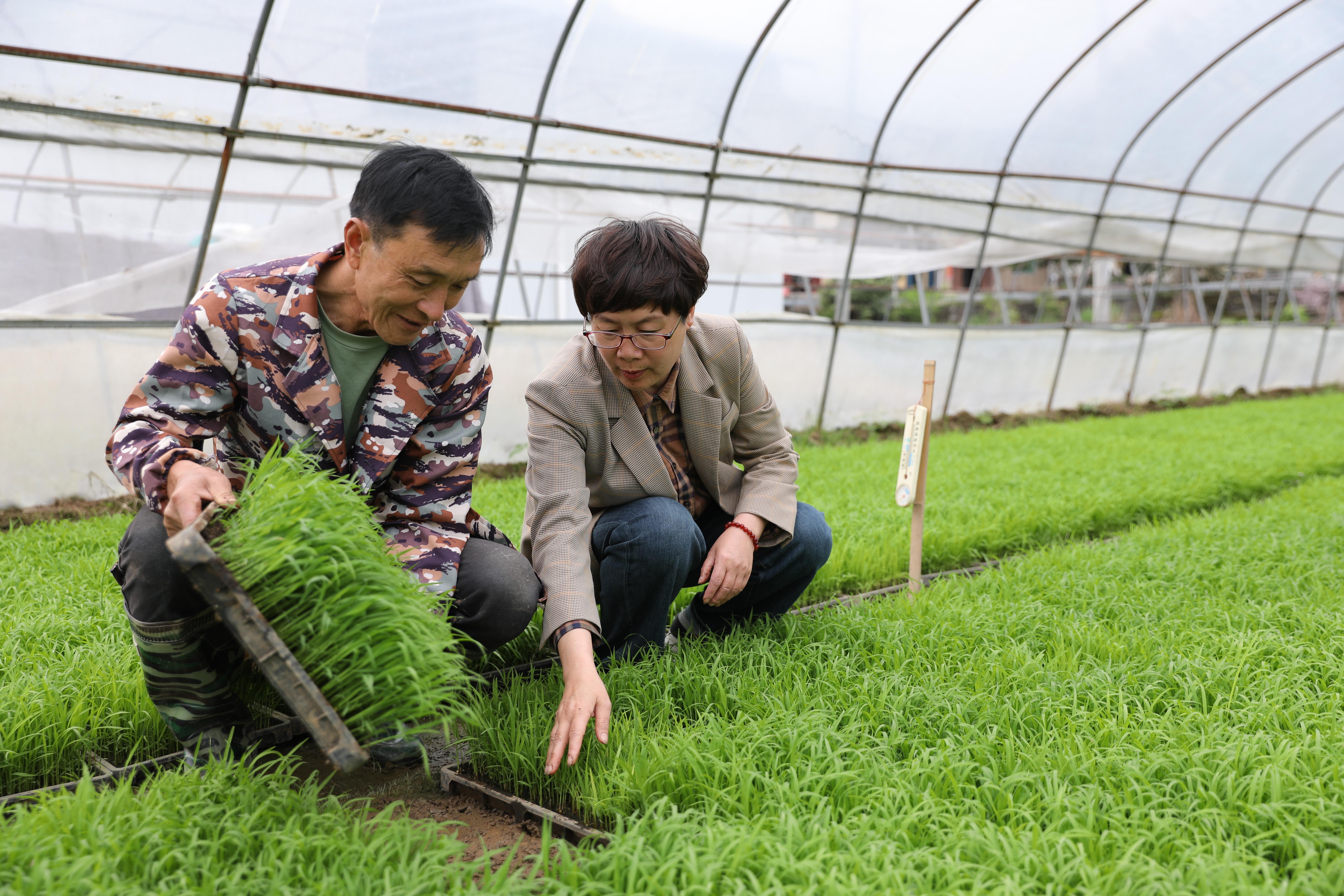 顺昌县科特派、高级农艺师徐丽华(左)在高阳乡洋香坪家庭农场指导种粮大户育秧。(资料图)