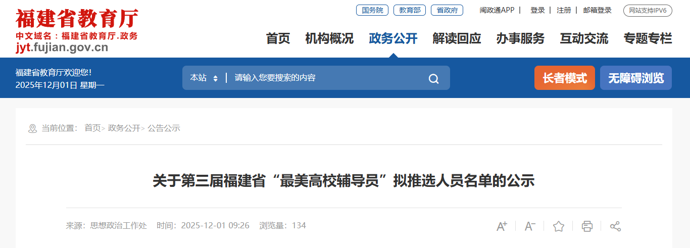 12月1日,福建省教育厅公布了第三届福建省“最美高校辅导员”拟推选人员名单,公示期为2025年12月1日—5日,一起来看——