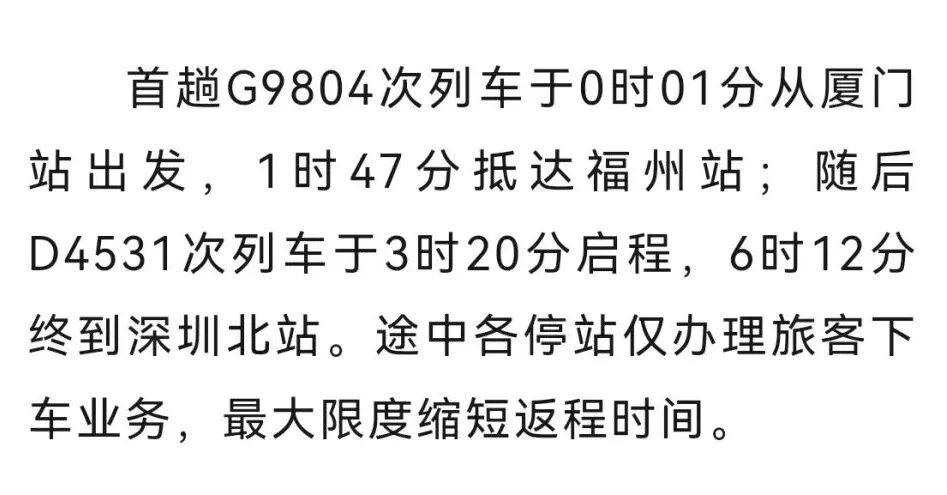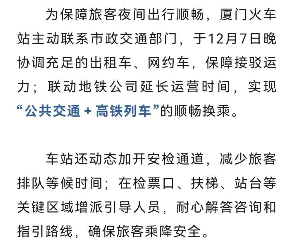 此外,厦门火车站精准施策,强化服务保障,安排工作人员加密候车室动态巡视频次,重点关注凌晨时段候车旅客状态,推出“人工叫醒”专项服务,安排工作人员适时提醒旅客检票时间,全力确保其按时乘车。