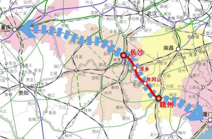 长赣高铁是中国铁路全面推广隧道全工序机械化施工作业的首条高铁。全长429.5公里,设计时速350公里,全线共设车站9座,建设工期计划5年。建成后,将与渝厦高铁其他铁路段共同形成重庆至厦门的高铁大通道。
