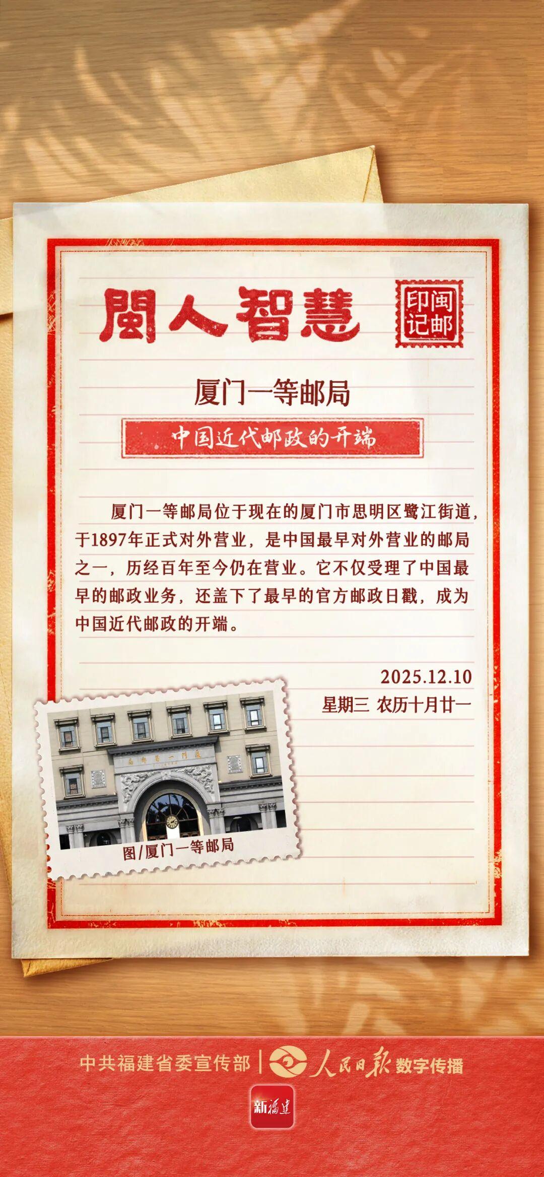厦门一等邮局位于现在的厦门市思明区鹭江街道,于1897年正式对外营业,是中国最早对外营业的邮局之一,历经百年至今仍在营业。它不仅受理了中国最早的邮政业务,还盖下了最早的官方邮政日戳,成为中国近代邮政的开端。