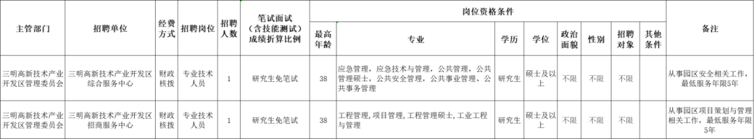 三明高新技术产业开发区管理委员会公开招聘专业技术人员2名