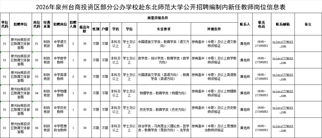 2026年泉州台商投资区部分公办学校赴东北师范大学公开招聘编制内新任教师公告