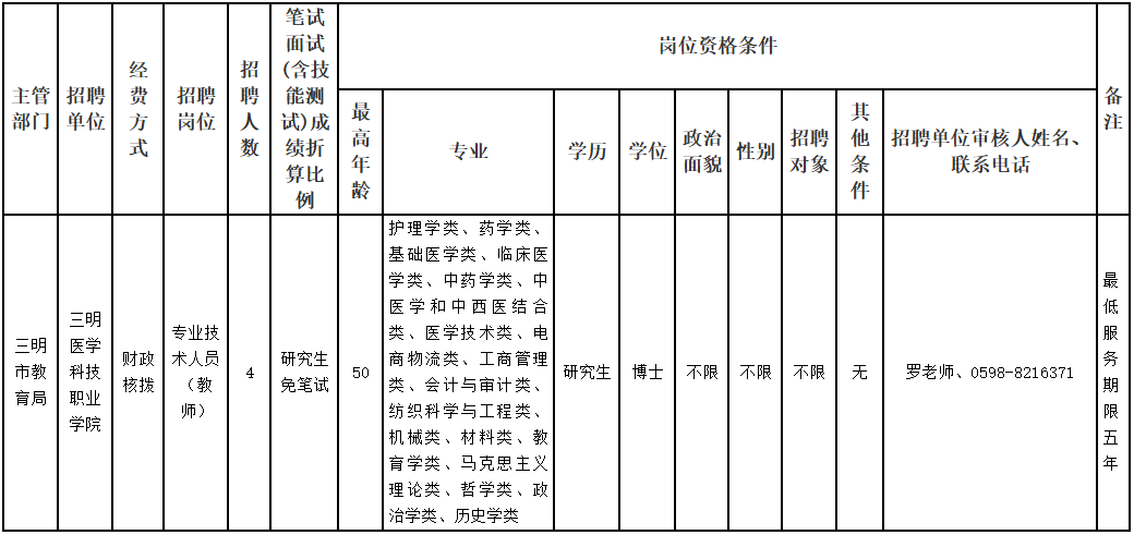 三明医学科技职业学院公开招聘博士研究生高层次人才4名