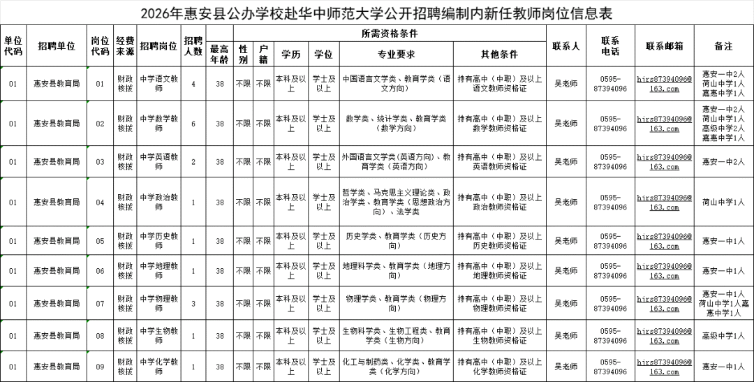 2026年惠安县公办学校赴华中师范大学公开招聘编制内新任教师公告